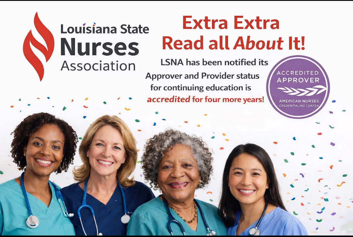 The Louisiana State Nurses Association (LSNA) has been reaccredited by the American Nurses Credentialing Center (ANCC) as both an accredited provider and approver of nursing continuing professional development. After successfully meeting the ANCC’s rigorous standards and comprehensive review process, LSNA’s accreditation has been extended for an additional four years.